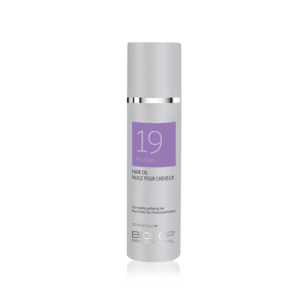 El 19 Pro Silver Hair Oil de BIOTOP PROFESSIONAL es un aceite capilar que ayuda a preservar y proteger los tonos naturales o teñidos del cabello rubio, platino, gris, blanco o plateado, evitando que se tornen amarillos o cobrizos.